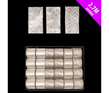 2.7M white/silver wired ribbon with decorative edge.