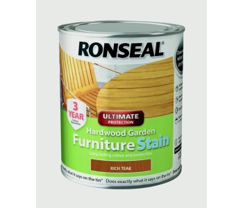 Ronseal hardwood garden furniture stain. Rich Teak.Long lasting colour and all weather protection. Resists cracking and peeling. Quickdrying. Rainproof in 1 hour.750ml.