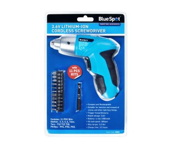 The Blue Spot Tools 3.6V Lithium-ion Cordless Screwdriver with 11 PCE bits is compact and rechargeable handheld screwdriver. The screwdriver and supplied bits are suitable for the insertion and removal of screws and other light-duty fixings.