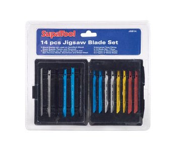 Features :Contains 6 x wood blades: 2x6 TPI Fast cut, 2x8 TPI Medium cut, 2x10 TPI Smooth cut.8x Metal blades: 2x 14 TPI Medium cut, 2x 18 TPI Medium cut, 2x 24 TPI Fine cut, and 2x 32 TPI Extra fine cut.